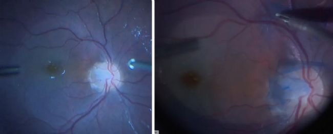 圖 15:涂抹 ILM 染料后,用 25g 儀器剝離 ILM。圖片由 Nikolaos Bechrakis 教授提供。