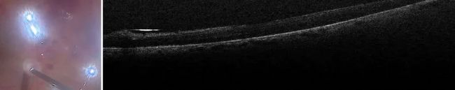 在這個病例中,剝離眼膜后,由于眼球內有空氣,出現了氣泡反射(圖 3)。通過術中 OCT,可以看到視網膜的氣場情況。這樣就可以看到視網膜下有多少液體,并檢查是否有殘留的眼膜。