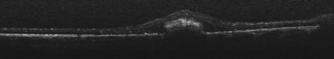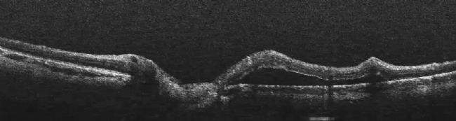 Müller 細胞柱和視網膜外部顯示這不是視網膜脫離(圖 6)。有人懷疑這可能是很淺的視網膜脫離或視網膜水腫。圖像毫無疑問地顯示這是視網膜裂孔。