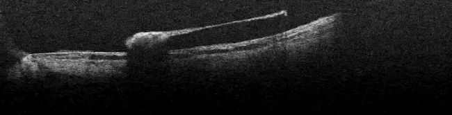 增生性糖尿病視網膜病變是光學相干斷層掃描的主要應用領域之一,包括術前應用。即使在使用染料的情況下,該技術也能準確顯示膜支架的區域。這樣,外科醫生就能看到用鑷子夾住薄膜的縫隙,而不會對薄膜下方的視網膜造成損傷(圖 2)。