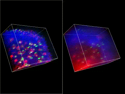 果蠅蓇葖果在THUNDER技術(shù) 3D 細(xì)胞培養(yǎng)上用 63X/1.4 油浸物鏡成像。上面的視頻是 27.5 微米厚的 Z 疊的三維最大投影。視頻顯示了原始外熒光數(shù)據(jù)和經(jīng)過 LVCC 處理的THUNDER技術(shù)圖像。