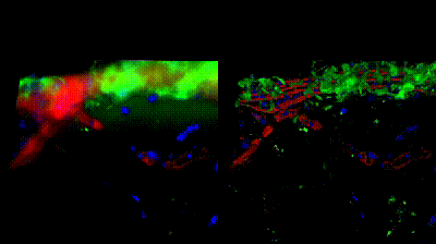 紅線--彈性層,綠色和紅色--血管細(xì)胞,藍(lán)色--DAPI,用 LAS X 3D Viewer 顯示。圖片由美國加利福尼亞州 Ying Wang 提供