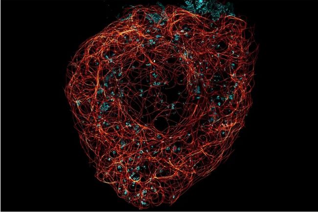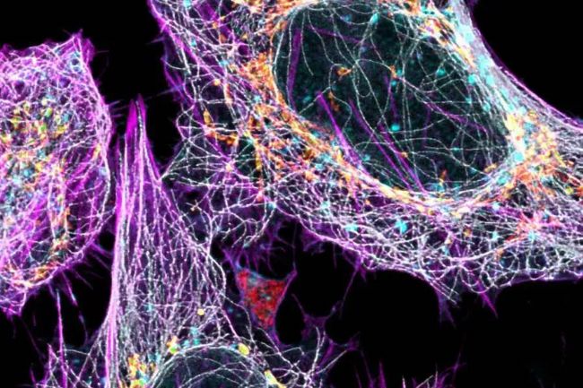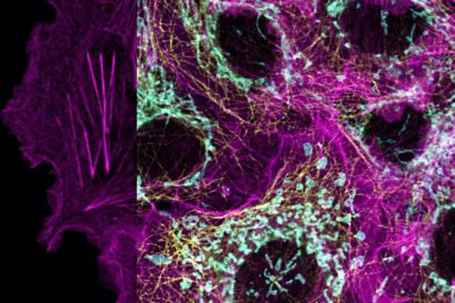 TauSTED 775解析了用SiR-tubulin(熒光 - Spyrochrome)標記的錯綜復雜的細胞骨架網絡,以及用CF594(青色 - Biotium)標記的運輸囊泡。