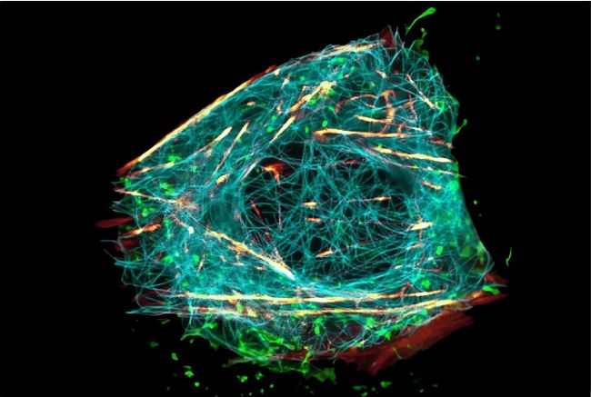 使用STELLARIS STED采集的圖像。U2OS細胞上的活細胞TauSTED,使用了肌動蛋白(SiR-actin,熒光)、微管(SPY555-tubulin,青色)和膜(CF488A偶聯WGA,綠色)標記。SiR和SPY可從Spirochrome購買。CF染料可從Biotium Inc.比例尺:10 微米。