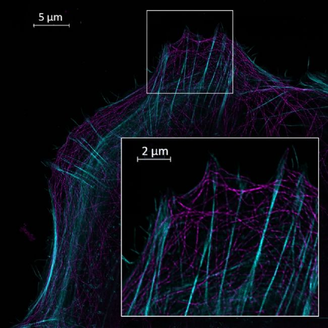 使用589納米STED激光進行多色TauSTED Xtend成像,采用兩種標準熒光團。CF440-鬼筆環肽(肌動蛋白,青色)和StarGreen-微管蛋白(洋紅色)。
