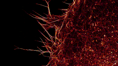 在神經母細胞瘤細胞系中的Lifeact-mNeonGreen,采用長期的TauSTED Xtend 589在低光劑量下進行成像,以表征細胞骨架動態。大視野范圍(120微米 x 120微米)。高分辨率成像(5912像素)。
