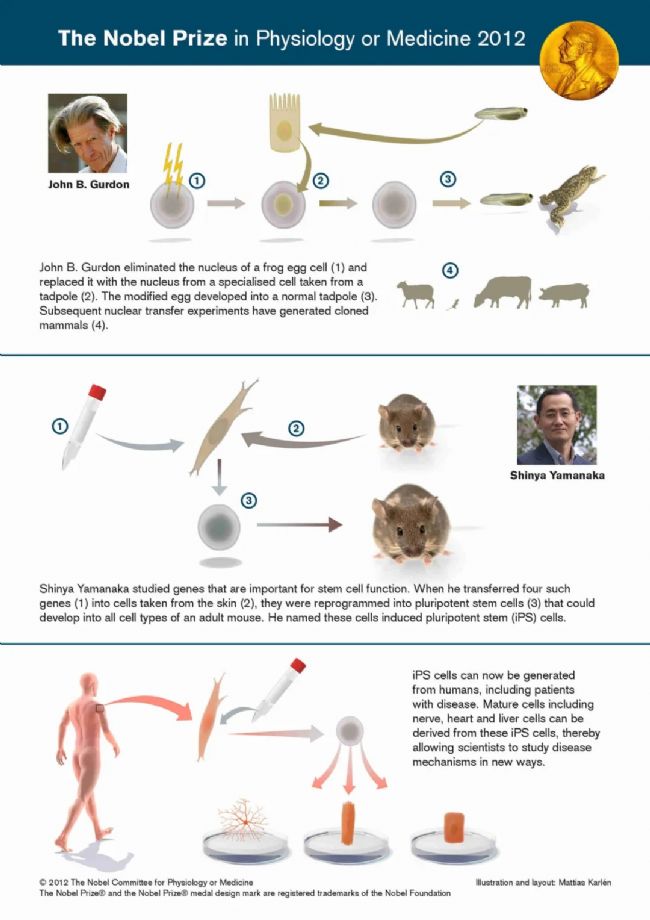 2012年10月8日,卡羅林斯卡醫學院諾貝爾委員會決定將2012年諾貝爾生理學或醫學獎聯合授予約翰·伯特蘭·格登(John B. Gurdon)和山中伸彌(Shinya Yamanaka),以表彰他們發現成熟細胞可以被重編程為多能細胞。