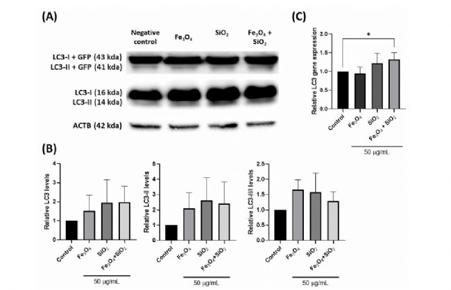 在本研究中,為了評估自噬調節(jié),生成了 LC3 轉染細胞。通過分析 LC3 的變化,Western blot和 RT-qPCR 證實了自噬的調節(jié)作用。結果發(fā)現(xiàn)納米顆粒處理后 LC3 的強度增加,表明自噬可能增強(如圖1)。