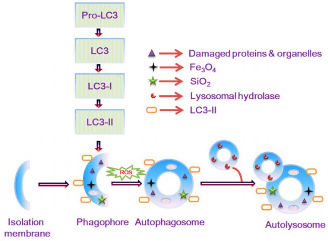 圖4.Fe3O4 和 SiO2 NPs 誘導的自噬機制示意圖