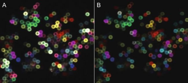 (A)11色微珠(名義直徑0.8微米)樣本的原始圖像,以及(B)使用STELLARIS集成的染料分離工具獲得的圖像。AF 405(藍色),AF 532(灰色),AF 594(橙色),AF 750(青色),AF 488(淺綠色),AF 555(黃色),AF 647(洋紅色),AF 790(紅色),AF 514(綠色),AF 568(紫色),AF700(淺黃色)。