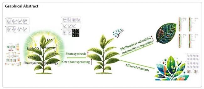 納米技術在農業領域具有革命性的潛力,氧化鋅納米顆粒(ZnO NPs)在促進作物生長方面顯示出優勢。光合作用效率的提高與茶樹活力和品質的提高密切相關,與葉際微生物維持植株健康也有關。然而,ZnO NPs對茶樹光合作用、新梢萌發和葉際微生物群落的影響還沒有得到充分的研究。7月2日,Journal of Nanobiotechnology在線發表了青島農業大學園藝學院范凱老師課題組題為Zno nanoparticles: improving photosynthesis, shoot development, and phyllosphere microbiome composition in tea plants的研究論文。文章揭示了ZnO NPs對茶樹光合作用和新梢發育的積極影響,并且對茶樹葉際附生微生物群落和葉際內生微生物群落起到了一定的改善作用。
