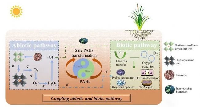 富鐵基質人工濕地(constructed wetlands, CWs)由于成本低等優點被廣泛應用于再生水回用領域,它可通過生物和非生物途徑實現微量有機污染物的高效去除。不幸的是,對于富鐵基質CW中促進羥基自由基(•OH)形成和確保多環芳烴(PAHs)安全轉化的必需活性鐵種類,特別是在長期運行的CWs中,仍然存在研究空白。此外,富鐵基質CW實現PAHs安全轉化的生物和非生物途徑之間的耦合關聯和機制仍然是一個研究空白。7月2日,Water Research在線發表山東大學環境科學與工程學院胡振教授課題組題為Biotic/Abiotic Transformation Mechanisms of Phenanthrene in Iron-rich Constructed Wetland under Redox Fluctuation的研究論文。文章對富鐵基質CW在不同氧化還原條件下對菲(Phenanthrene)轉化過程進行了探索。利用Mössbauer光譜分析技術闡明了參與•OH生成的關鍵活性鐵物種,利用宏基因組學技術闡明了菲在富鐵CW中的生物轉化機制。最后,通過冗余分析(RDA)和偏最小二乘路徑建模(PLS-PM)揭示了生物/非生物轉化機制對菲轉化的貢獻及其關聯關系。