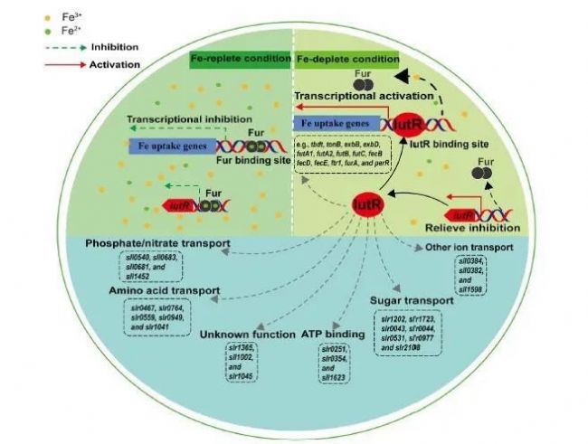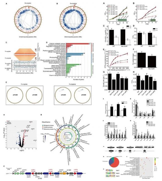 研究團隊利用Hi-C分析集胞藻在鐵充足和缺鐵條件下的三維基因組結構,發現基因互作頻率發生顯著變化。缺鐵條件下,集胞藻基因組上0.1M區域的互作強度明顯增加;CID邊界發生調整,影響眾多參與細胞代謝、細胞通訊、離子結合及受體活性等功能的基因。為了深入分析三維染色體結構與基因表達在不同鐵水平下的關聯,該研究進一步結合缺鐵條件下的轉錄組分析發現,上述互作頻率顯著增強的0.1M區域是藍藻缺鐵響應基因分布密集區,包括IutR在內的眾多基因分布于該區域,并且均在缺鐵時顯著上調表達,預示著這些基因很可能參與藍藻的缺鐵適應過程。研究團隊通過對三個同源iutR基因的單敲除和組合三敲除,發現組合三敲除的藻株對缺鐵條件極為敏感,多個生理表型在缺鐵條件下與野生型表現出顯著差異,但在鐵充足時與野生型沒有差別,將IutR重新回補到突變株中可以恢復至野生型的生理表型,表明IutR的缺失突變是藍藻缺鐵敏感的主要原因。與此同時,qRT-PCR結果表明,突變株中鐵吸收相關基因喪失了受缺鐵誘導上調表達的能力,說明突變株的缺鐵信號轉導過程受到嚴重影響。隨后,該研究利用轉錄因子和DNA互作實驗(EMSA和酵母單雜交)證明,IutR蛋白能夠結合并調控包括TonB依賴性鐵轉運系統在內的多個鐵吸收相關基因啟動子序列。通過ChIP-seq實驗,研究不僅鑒定了IutR結合的DNA序列特征,還預測了全基因組中IutR可能調控的靶基因,包括Fe3+吸收轉運蛋白FutABC、Fec家族、isiB、ftr1及FurA等。此外,RT-qPCR和EMSA實驗進一步確認了所預測的啟動子序列可以被IutR蛋白結合,并且這些基因的轉錄水平受到IutR的顯著調控。