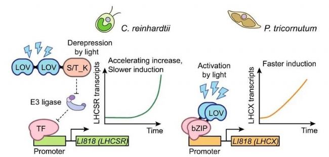 進一步研究表明,AUREO1c蛋白利用LOV結構域探測光照壓力,并通過其bZIP DNA結合域直接激活靶基因(包括編碼NPQ效應蛋白的LI818基因)的表達。與在淡水綠藻——萊茵衣藻(Chlamydomonas reinhardtii)中報告的激酶介導的途徑相比,AUREO1c途徑展現出了更快的響應速度,并能夠在連續高光照和波動光照處理下,使LI818的轉錄本和蛋白水平累積到相當的程度。