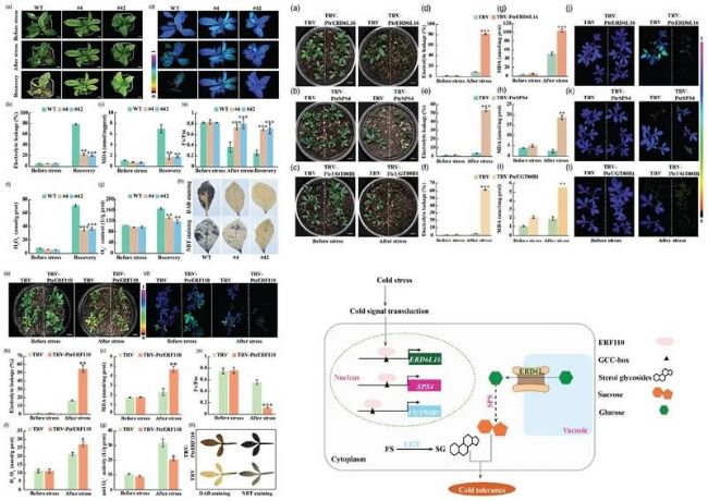 綜上所述,該研究結果表明PtrERF110 通過轉錄激活PtrERD6L16、PtrSPS4和PtrUGT80B1直接調節糖和甾醇的合成,從而正向調節抗寒性。本研究揭示的調控模塊 (ERF110-ERD6L16/SPS4/UGT80B1) 有助于我們了解植物在寒冷脅迫下糖和甾醇積累的分子機制。本研究中,柑橘植物葉片冷脅迫下光合生理活性相關的葉綠素熒光數據通過超葉綠素熒光成像系統IMAGING-PAM測量完成。