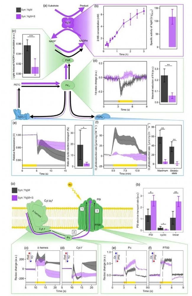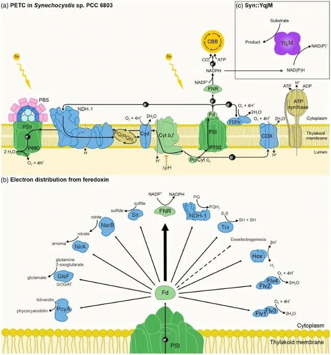 圖注:在模式藍藻Synechocystis sp. PCC 6803中,光合電子傳遞鏈(PETC)與來自鐵氧還蛋白(Fd)的電子分布構成了其光合作用的核心機制。