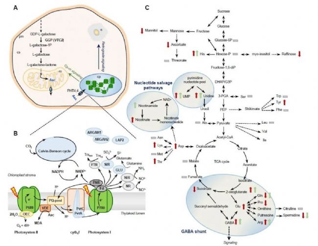 圖注:葉綠體Asc控制植物的新陳代謝。A) Asc的生物合成在細胞質(zhì)中進行,最后一步在線粒體中進行,vtc2編碼GDP-L半乳糖磷酸化酶(GGP),催化Asc生物合成的第一步。PHT4;4將Asc轉(zhuǎn)運到葉綠體中。B)可能與葉綠體Asc相互作用的光合電子傳遞元件和基質(zhì)酶(根據(jù)本研究中的PISA分析,用藍色表示)。C)葉綠體和細胞Asc缺乏會導(dǎo)致代謝組發(fā)生廣泛變化,包括誘導(dǎo)GABA分流和核苷酸補救合成途徑。深紅色和淺綠色箭頭分別表示vtc2-4突變體和pht4;4-3突變體與WT(Col-0)相比,相應(yīng)代謝物發(fā)生了顯著變化。灰色條表示已鑒定出特定代謝物,但未檢測到相對于WT的顯著變化。