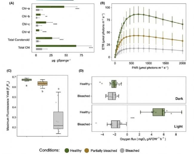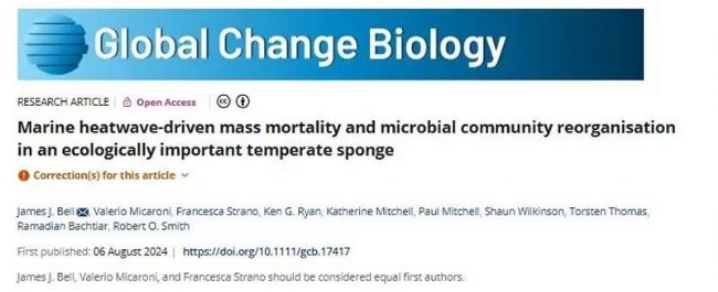 2. Marine heatwave-driven mass mortality and microbial community reorganisation in an ecologically important temperate sponge (Global Change Biology, IF=10.8)隨著全球氣候的不斷變化,海洋熱浪(MHWs)的頻率、持續(xù)時間和強度都在增加,破壞了全球海洋生態(tài)系統(tǒng)。雖然報告的大多數(shù)影響都發(fā)生在熱帶地區(qū),但新西蘭卻在2022年經(jīng)歷了強度最大、持續(xù)時間最長的海洋熱浪,對海洋海綿造成了嚴重影響。海綿對巖石底棲海洋生物群落至關(guān)重要,其數(shù)量影響著生態(tài)系統(tǒng)的功能。2024年8月6日,Global Change Biology在線發(fā)表新西蘭維多利亞大學(xué)生物科學(xué)學(xué)院James J. Bell等人標(biāo)題為Marine heatwave-driven mass mortality and microbial community reorganisation in an ecologically important temperate sponge的研究論文。文章探討了2022年那次MHW對新西蘭峽灣地區(qū)光合作用海綿(Cymbastella lamellata)的影響。