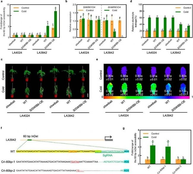 研究人員在煙草系統(tǒng)和野生型擬南芥蟲咬應(yīng)答條件下復(fù)現(xiàn)了NAD+含量降低激活單線態(tài)氧和茉莉酸合成的信號轉(zhuǎn)導(dǎo)通路,表明此信號轉(zhuǎn)導(dǎo)通路能夠在植物調(diào)節(jié)自身代謝以平衡生長與抗性中起重要作用。因此,本項研究首次揭示了“NAD+穩(wěn)態(tài)->單線態(tài)氧激活->茉莉酸合成轉(zhuǎn)導(dǎo)->次級代謝產(chǎn)物(芥子油苷)合成”的完整應(yīng)答通路介導(dǎo)植物抗(蟲)性防御反應(yīng)的分子機制,從而提出了NAD+穩(wěn)態(tài)是平衡植物生長與抗(蟲)性的關(guān)鍵“代謝監(jiān)測點”(metabolic checkpoint)的分子模型(圖1),為深入了解植物—環(huán)境互作的信號轉(zhuǎn)導(dǎo)機制與代謝基礎(chǔ)提供了新見解,也為植物抗性改造和育種增添了理論基礎(chǔ)。番茄是全球重要的蔬菜作物,起源于南美洲安第斯山脈地區(qū)。在番茄的進化和人類選擇過程中,由于生長環(huán)境的改變(從高海拔到低海拔),使得低溫不再是番茄進化選擇的主要逆境壓力,這造成了現(xiàn)代栽培番茄耐寒能力下降。然而,隨著我國設(shè)施農(nóng)業(yè)的快速發(fā)展,冬春低溫造成的設(shè)施蔬菜冷害業(yè)已成為限制產(chǎn)業(yè)高質(zhì)量發(fā)展的瓶頸問題。因此,解析設(shè)施主栽喜溫蔬菜番茄耐寒能力下降的機制,創(chuàng)制耐寒種質(zhì)和調(diào)控技術(shù),對于產(chǎn)業(yè)發(fā)展具有重要意義。2024年8月6日,浙江大學(xué)喻景權(quán)院士周杰教授團隊在Nature Communications在線發(fā)表了題為“Loss of cold tolerance is conferred by absence of the WRKY34 promoter fragment during tomato evolution”的研究論文。該研究以冷敏感的栽培番茄 (Solanum lycopersicum)和耐寒的野生多毛番茄(Solanum habrochaites)為對象,通過多組學(xué)聯(lián)合分析以及生理生化、遺傳學(xué)和生物信息學(xué)等手段,揭示了在野生番茄和栽培番茄中WRKY34低溫表達模式差異的原因,及其調(diào)控番茄耐寒能力的具體機制。