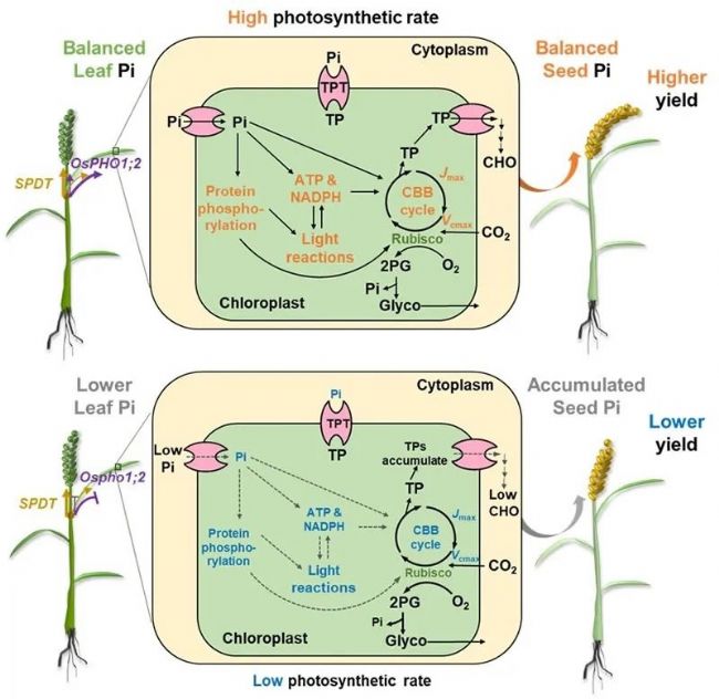 光合作用是作物改良的重要目標(biāo)之一。光合葉片中的無機磷(Pi)作為ATP合成原料并參與光合蛋白調(diào)控以及磷酸丙糖(TP)等光合產(chǎn)物周轉(zhuǎn),葉片中其含量在一定條件下可能成為光合作用高效運轉(zhuǎn)的限制因素。實際上,田間光合作用的磷限制常發(fā)生在抽穗灌漿階段、需要光合作用高效運轉(zhuǎn)的時期。葉片(源)與種子(庫)之間的Pi分配對作物籽粒灌漿有重要影響,然而,Pi在源庫之間如何分配調(diào)控及其對葉片光合效率的影響尚需解析,有效的遺傳解決方案仍有待建立。