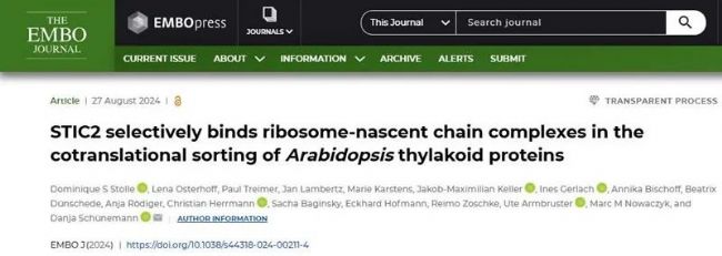 10. STIC2 selectively binds ribosome-nascent chain complexes in the cotranslational sorting of Arabidopsis thylakoid proteins (The EMBO Journal, IF=9.4)葉綠體編碼的多種跨類囊體膜蛋白質(zhì)對光合作用復(fù)合物至關(guān)重要,但人們對其生物發(fā)生的協(xié)調(diào)過程仍然知之甚少。2024年8月27日,The EMBO Journal在線發(fā)表德國魯爾大學(xué)Danja Schünemann課題組標(biāo)題為STIC2 selectively binds ribosome-nascent chain complexes in the cotranslational sorting of Arabidopsis thylakoid proteins的研究論文。文章將STIC2 確定為一種新的核糖體相關(guān)因子,并提出STIC2與cpSRP54合作,將D1和潛在的其他葉綠體編碼的光合亞基共翻譯遞送至類囊體膜。