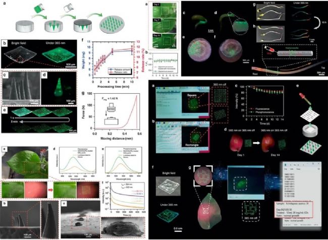 利用植物發(fā)光標(biāo)簽構(gòu)建植物信息云平臺的示意圖在先前報道的工作中,將材料送入植物的常用方法包括葉面噴霧、根部吸收和樹干/葉柄注射。然而,這些方法在將微米級顆粒送入植物方面存在局限性。雖然樹干/葉柄注射方法可以通過機械損傷角質(zhì)層和表皮等屏障直接進入維管系統(tǒng),但其侵入性使其只適合某些大型木本植物。近年來,微針貼片因其最小的侵入性、安全性和效率,在藥物輸送應(yīng)用中被使用,呈現(xiàn)出一種有前景的替代方案。在先前的報告中,近紅外發(fā)光顆粒通過微針貼片注入皮膚,以記錄疫苗接種的長期信息。從醫(yī)療領(lǐng)域的微針貼片中汲取靈感,研究人員采用它們將長余輝材料送入植物葉片,實現(xiàn)信息記錄和編碼。為了構(gòu)建植物中的信息記錄平臺,首先將SAO與H3PO4封裝以增強耐水性,并在植物復(fù)雜的內(nèi)部環(huán)境中保持穩(wěn)定的發(fā)光。然后,將微針貼片的尖端裝載SAO@H3PO4,創(chuàng)建排列良好的發(fā)光陣列,為植物提供特定的編碼信息。這些信息的匯編旨在建立一個智能農(nóng)業(yè)平臺,其中植物發(fā)光標(biāo)簽作為通往云平臺的門戶,用于存儲各種生理信息,并實現(xiàn)基于物聯(lián)網(wǎng)的精準(zhǔn)農(nóng)業(yè)系統(tǒng)。