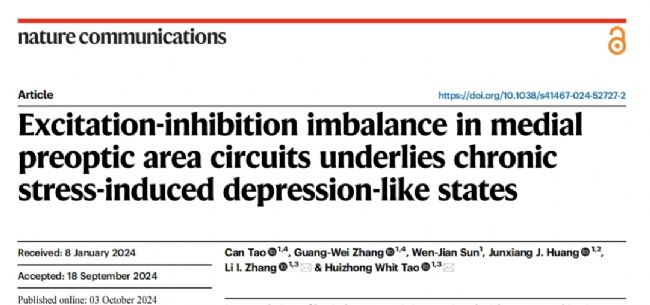 2024年10月3日南加利福尼亞大學Huizhong Whit Tao和Li I. Zhang團隊在Nature Communications雜志上發表文章揭示了MPOA回路神經元E/I紊亂介導抑郁的發生。