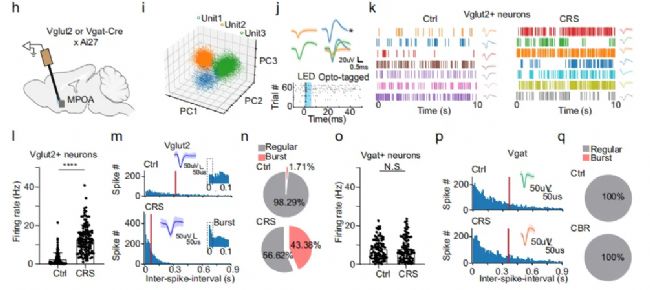 慢性束縛應激(chronic restraint stress ,CRS)可引起小鼠抑郁樣行為。電生理實驗發現CRS可增加MPOA腦區谷氨酸能神經元放電頻率,簇狀放電神經元比例增多,自發性興奮性突觸后電流增強,但不影響GABA能神經元放電頻率。光纖鈣成像技術記錄到在經歷CRS第7天后MPOA腦區谷氨酸能神經元鈣離子活性增強,這種增強一直持續到CRS造模結束,這些結果表明CRS通過增加MPOA腦區谷氨酸能神經元活性增加E/I比值。