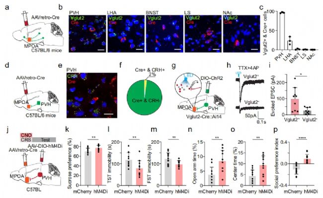 病毒示蹤實驗發現MPOA接受來自于外側隔核、伏隔核、下丘腦室旁核(paraventricular hypothalamic nucleus,PVH)等腦區,其中接受PVH的谷氨酸輸入最多。進一步的實驗表明PVH支配MPOA的谷氨酸能輸入比抑制性GABA更多。在CRS造模期間慢性抑制PVH→MPOA環路可阻斷慢性應激引起的焦慮和抑郁樣行為,但在CRS造模之后慢性抑制上述環路并不改善焦慮和抑郁樣行為,表明PVH→MPOA環路僅參與應激引起抑郁樣行為的誘導階段。