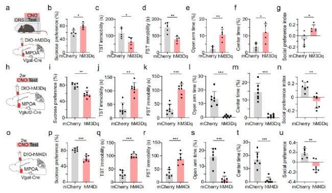 MPOA的谷氨酸能神經元可投射到腹側被蓋區(ventral tegmental area,VTA)和腹外側中腦導水管周圍灰質(ventrolateral periaqueductal gray ,VLPAG)。電生理實驗發現在光激活MPOA的谷氨酸神經元后主要抑制VTA腦區多巴胺神經元活性。抑制MPOA→VTA環路可改善慢性應激引起的社交障礙和糖水缺失,但不影響懸尾實驗和強迫游泳的不動時間以及焦慮樣行為。在抑制MPOA→VLPAG環路可改善慢性應激引起的焦慮樣行為和不動時間,但不改善糖水缺失。
