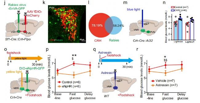 病毒示蹤實驗表明在PVH-CRH神經元和VMH-CRHR2神經元均能接受肝臟的逆行投射纖維。VMH腦區注射CRHR2拮抗劑或切除支配肝臟的交感神經均能減少捕食者引起的逃跑反應。這些結果表明下丘腦-交感神經-肝軸介導急性應激引起的即時血糖升高。