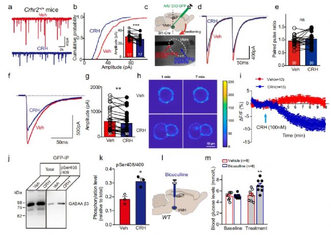 進一步電生理實驗發現CRH通過減少GABAA受體轉運到突觸后膜進而抑制VMH-SF-1神經元的抑制性突觸后電流。大多數GABAA受體由2α, 2β 和 1γ亞基組成,其中CRH僅降低GABAA受體 β3亞基。GABAA受體 β3亞基的膜轉運通過激活其Ser408/409磷酸化位點實現的。然而,離體細胞實驗發現CRH可降低GABAA受體 β3亞基Ser408/409磷酸化水平。