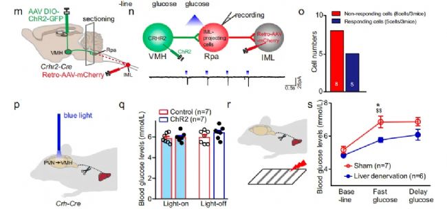 下丘腦通過激活中間帶外側核(intermediolateral nucleus,IML)支配的交感神經元促進肝臟合成葡萄糖。病毒示蹤實驗發現投射到IML的RPa神經元同時也接受VMH-CRHR2神經元的興奮性輸入。切除支配肝臟的交感神經后可阻斷急性應激引起的即時血糖升高,也阻斷激活PVH-CRH→VMH環路引起的血糖升高。