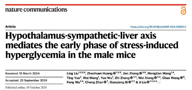 2024年10月5日中國科學技術大學劉際團隊在Nature Communications雜志上發表文章揭示了下丘腦-交感神經-肝軸不依賴腎上腺活性調控急性應激引起的快速血糖升高。
