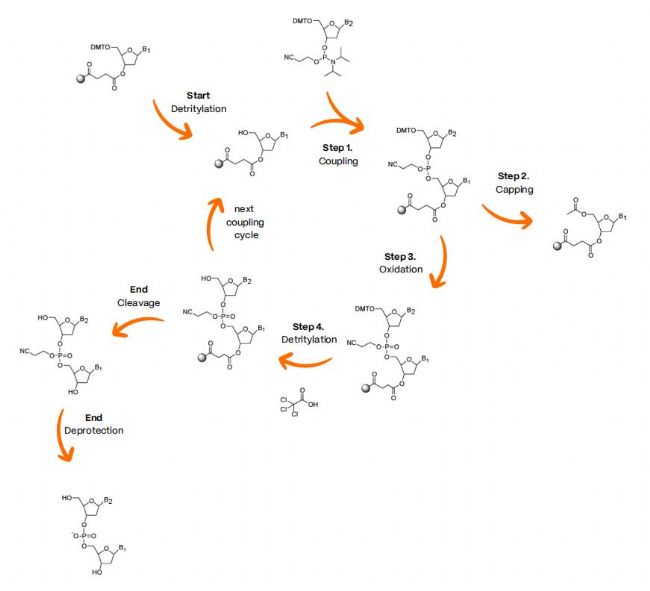 寡核苷酸固相亞磷酰胺化學合成循環涉及以下步驟(圖 1):3,4