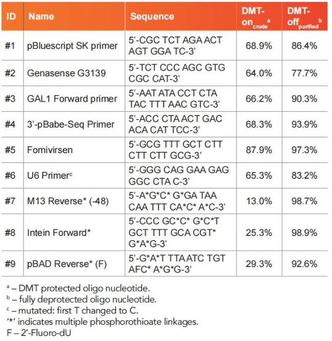 所有截短序列均通過封端乙酰化,且不攜帶疏水性 DMT 保護基團。脫鹽,并使用 Glen-Pak DNA 純化柱 (PN 60-5200-10) 通過反相固相萃取以 1 µmol 的規模將截短序列與 DMT 靶序列分離。