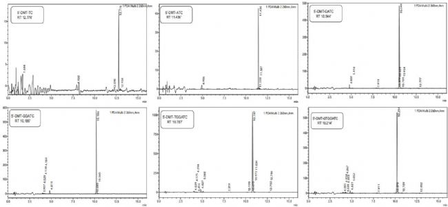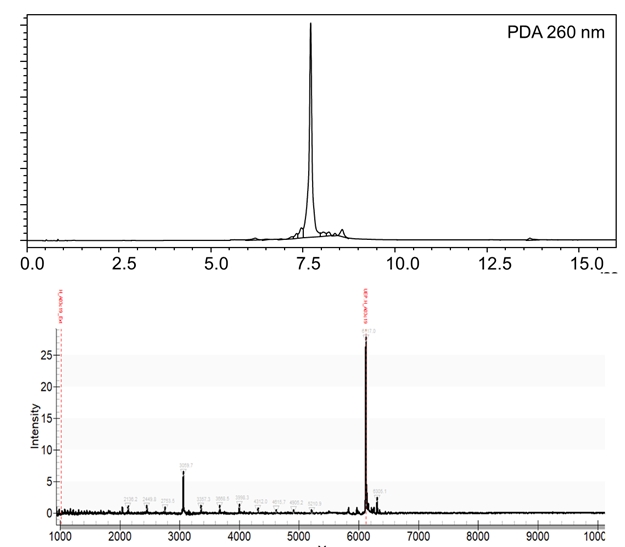 將粗寡核苷酸溶液(100 uL 裂解溶液中取 5 uL)稀釋在 165 uL isopropanol (i-PrOH)/ACN/water(7:1:2)混合溶液中,然后在 Shimadzu HPLC (SPD-M20A 光電二極管陣列檢測器)上進行分析(3 uL 注射量)。分離在 C18-PFP、100 Å、3.0 μm、100 x 3.0 mm柱(Mac-Mod ACE Excel C18-PFP)上進行,耗時 15 分鐘,流速為 0.8 mL/min,使用 5-50% B / A 的梯度,其中緩沖液 A 為 0.1 M triethylamine acetate (TEAA) 水溶液(pH 7),緩沖液 B 為純 ACN。在四個波長處監測吸光度, 260 nm 檢測數據用于分析報告。在 ShimadzuLCMS2020 單四極桿 ESI 質譜儀上進行質譜檢測。另外,在 Agena Biosciences 公司使用 MALDI-TOF 質譜儀 MassARRAY Analyzer (Agena Biosciences, Inc.) 對最終產品進行質量測定。