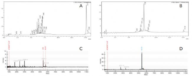受到寡核苷酸偶聯研究初步結果的鼓舞,我們繼續合成寡核苷酸 #2。在這個例子中,我們強調了如何使用 DMT-on方法輕松去除雜質。圖 3 顯示了純化前的粗 DMT-on寡核苷酸(A 和 C)和純化后的 DMT-off寡核苷酸(B 和 D)。雖然從 UV 色譜圖可以看出改進,但通過 MS 分析觀察到剩余的截短序列(D)。對于 #2 也可以觀察到這種現象,其中多個截短序列隱藏在產品主峰下(圖 4)。