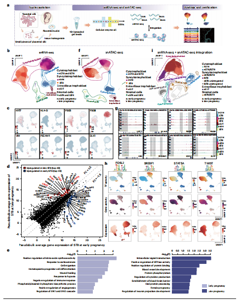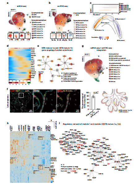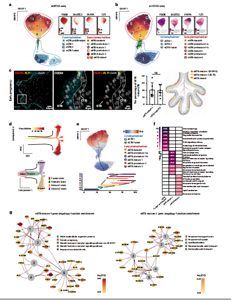 為了系統(tǒng)地研究人類胎盤STB在妊娠后期的發(fā)展,檢測(cè)了來自STB和CTB核的大規(guī)模單核轉(zhuǎn)錄組(23981個(gè)核)和表觀基因組(24692個(gè)核)數(shù)據(jù)集。質(zhì)量控制(補(bǔ)充圖7a-d)的CTB亞型注釋見補(bǔ)充說明15。以前用于妊娠早期核類型分類的基因集在妊娠晚期樣本中顯示出顯著的一致性(圖5a、b,補(bǔ)充圖7e、f和補(bǔ)充表3)。聚類11和聚類6被歸類為妊娠晚期STB的兩種新生核類型,其中SH3TC2高表達(dá)(STB新生1和lSTB新生2)。PAPPA的表達(dá)在妊娠后期顯著增加,并在5個(gè)STB亞群中存在,包括簇4(STB成熟1-a)、簇1(STB成熟1-b)、簇3(STB成熟1-a)、簇2(STB成熟1-b)和簇7(STB成熟1-c)。相比之下,F(xiàn)LT1僅在第5簇(STB成熟2-a)中檢測(cè)到表達(dá),部分在第8簇(STB成熟2-a)中檢測(cè)到表達(dá),這代表了妊娠晚期STB的一小部分細(xì)胞核(圖5a)為了進(jìn)一步揭示驅(qū)動(dòng)STB核異質(zhì)性的分子機(jī)制,并將新注釋的STB核亞簇放置在一個(gè)確定的軌跡上,進(jìn)行了偽時(shí)間分析(圖5c,d)。用靶向PSG8、SH3TC2、LEP、PAPPA和FLT1基因的探針對(duì)妊娠后期的胎盤進(jìn)行染色。FLT1和PAPPA的smFISH結(jié)果表明,有相當(dāng)一部分STB核表現(xiàn)出PAPPA的表達(dá),這與的生物信息學(xué)分析一致(圖5f和補(bǔ)充說明17)。