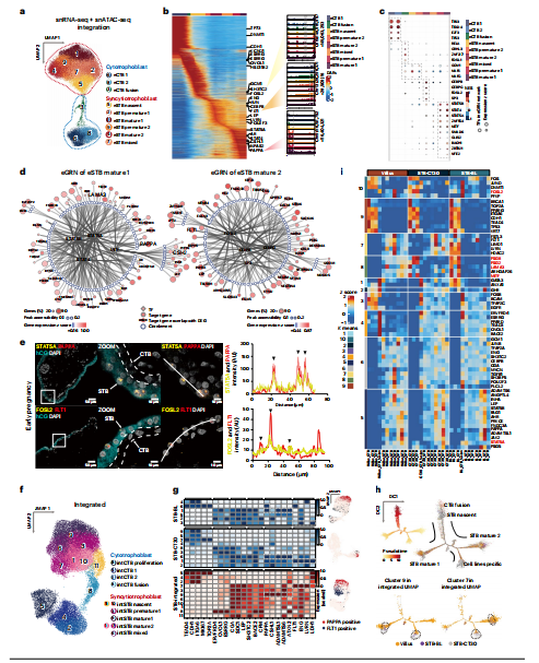 為了研究早期信號(hào)通路中基因的反應(yīng)模式,根據(jù)每個(gè)細(xì)胞簇中不同時(shí)間點(diǎn)的eSTB的異質(zhì)性和譜系規(guī)范,使用liger45進(jìn)行了交叉模態(tài)整合分析,并根據(jù)整合分析將所有eSTB核分為9個(gè)聚類(圖3a)。連接數(shù)據(jù)集識(shí)別的主要STB核亞型與snATAC-seq或snRNA-seq單獨(dú)識(shí)別的STB核亞型相當(dāng)(補(bǔ)充圖5a、b和補(bǔ)充說明9)。試圖確定不同STB核亞型的主調(diào)控因子,并沿著妊娠早期推斷的分化軌跡描繪它們的調(diào)控景觀。使用MACS2來識(shí)別候選的順式調(diào)節(jié)元件(cCREs)46。為了實(shí)現(xiàn)這一點(diǎn),分別對(duì)每種細(xì)胞類型進(jìn)行了峰值調(diào)用。隨后,合并了所有已鑒定出的峰,結(jié)果在所有CTB亞簇和STB亞簇中共鑒定出274,189個(gè)順式元素。在這些元素中,~值為8.66%(23,746),表現(xiàn)出核亞型特異性的可及性(圖3b);發(fā)現(xiàn)了與SH3TC2、FLT1、PAPPA、ESRRG、OVOL2、STAT5A、HIF1A和CEBPB基因相關(guān)的cCREs沿STB核STB核分化路徑的可及性動(dòng)態(tài)(圖3b,補(bǔ)充圖4和補(bǔ)充說明10)。還提名了可能作為引導(dǎo)STB核分化為兩種軌跡的主調(diào)控因子(圖3c和補(bǔ)充說明11)。