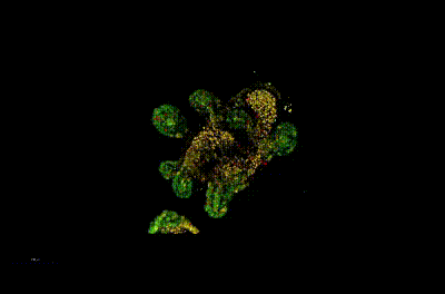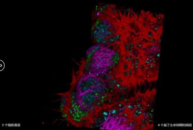 通過Hoechst 標記細胞核。熒光壽命的差異反映了DNA壓縮程度的不同。較長的熒光壽命(紅色)對應于具有更多開放閱讀框架和活躍DNA轉錄的細胞,如干細胞。該視頻采用多光子(DIVE)和熒光壽命(FALCON)技術進行獲取。