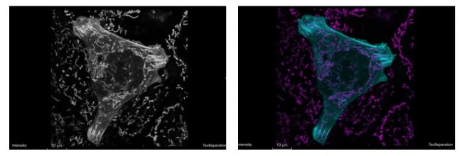 標記有MitoTracker Green的表達LifeAct-GFP的哺乳動物細胞(由ibidi GmbH生產)。采集由一個檢測器完成,分離由TauSeparation執行。