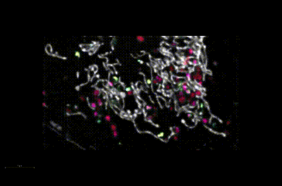 用 MitoView Green 標記的線粒體。用 CellBright NIR750 標記的膜泡。使用 TauSeparation,根據與囊泡內吞成熟相關的 pH 值成熟步驟進行壽命成分分離,揭示不同的內吞步驟。