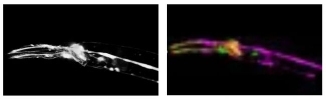 使用STELLARIS 8 FALCON以單一激發線和單一探測器獲得了一幅標記有四種紅色熒光蛋白的秀麗隱桿線蟲神經元的三維共聚焦圖像。這四種不同的信號是通過相位分離技術獲得的。采用單一激光線和探測器不僅提升了實時成像的速度,也降低了所需的激光劑量。灰色表示僅強度信息,彩色表示合并后的相位分離信號。標尺:20微米。通過FLIM在單一探測器上跟蹤4種不同的神經元類型。