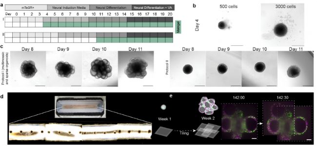 圖1.腦類器官培養 a)本研究開發的流程示意圖(流程I)和之前的多區域人腦類器官(流程II)b)在兩種細胞接種濃度下,聚集后第4天類器官大小的比較,比例尺為500μm c)顯示在兩種不同的流程下,第8-11天類器官生長的名稱圖像 d)樣品保持室的照片,包含四個分隔的子室,每個子室有四個微孔,用于生長和成像16個不用的類器官,每個微孔一個。