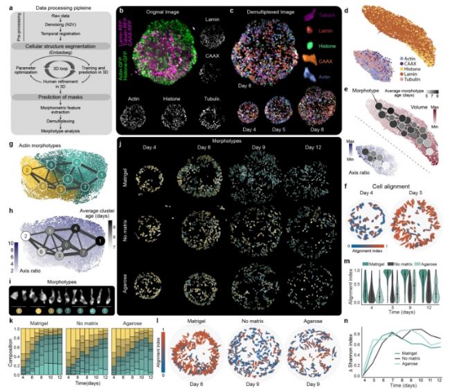 圖4. 使用接多路多位點細胞標簽的細胞和細胞核形態轉變。a)分析策略示意圖。b) 第 6 天的類器官最大強度投影,標記有核膜(Lamin,RFP,粉色)、質膜(CAAX,RFP,粉色)、肌動蛋白(GFP,綠色)、微管蛋白(RFP,粉色)和細胞核(組蛋白,GFP,綠色)c) 解通道圖像(Lamin,深棕色;CAAX,橙色;肌動蛋白,藍色;微管蛋白,品紅色;組蛋白,綠色) d) 基于形態特征提取的所有解多通道標簽的 PAGA 初始化 UMAP 嵌入。e) PAGA 初始化 UMAP 嵌入顯示肌動蛋白、微管蛋白和 CAAX 標簽的軸長變化,以及使用組蛋白和 Lamin 分割測量的細胞核體積變化。PAGA 圖顯示平均簇年齡(天數)的變化,節點大小表示一個簇內的細胞數量,邊寬反映兩個簇之間的連接強度。f) 在 matrigel 條件下,所有細胞(肌動蛋白)按其對齊指數(與最近的類器官表面法線的絕對余弦角)著色。比例范圍為 0-1,其中 1(紅色)對應于與類器官表面垂直對齊的細胞。g) PAGA 初始化的 UMAP 嵌入和 PAGA 圖顯示使用從基質膠、無基質和瓊脂糖條件下分割的細胞的細胞形態類型聚類。圖基于提取的所有分割細胞(肌動蛋白)的形態測量。h) PAGA 初始化的 UMAP 嵌入顯示細胞軸比隨時間變化,并疊加顯示使用 PAGA 圖的平均聚類年齡。PAGA 圖根據聚類的平均年齡從淺灰色到黑色進行顏色編碼。i) 每個形態類型聚類的示例細胞(肌動蛋白)。j) 顯示標記有肌動蛋白的細胞的類器官示例圖像,顯示按其形態類型聚類著色的細胞。k) 堆疊條形圖顯示在基質膠、無基質和瓊脂糖條件下各個肌動蛋白形態類型聚類中細胞的比例。l) 圖像顯示在第 6 天基質膠條件下的細胞(肌動蛋白)根據細胞對齊指數著色,以及在第 9 天無基質和瓊脂糖條件下的細胞。m) 小提琴圖顯示在第 4 天到第 12 天所有三種條件下所有分割細胞的細胞對齊(肌動蛋白)值。n) 線圖顯示在三種條件下香農指數的變化,基于隨時間變化的每個簇的細胞數量(基質膠 (n=3)、無基質 (n=3) 和瓊脂糖 (n=3))。