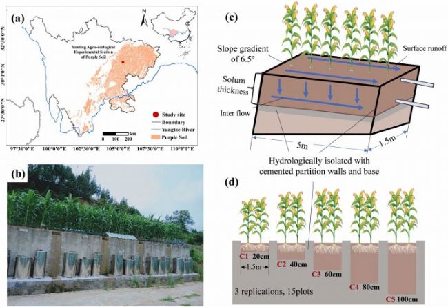 現場監測共設計15個小區。小區尺寸為5mx 1.5m,坡度為6.5°,模擬長江上游坡耕地的平均梯田坡度。試驗設置了5種土壤厚度處理(20 cm、40 cm、60 cm、80 cm、100 cm),每個處理重復3次。試驗小區通過無縫水泥墻和基座進行水文隔離,構建不同厚度的防滲混凝土盆并重新填筑原有土層。經過8年的常規耕作(小麥-玉米輪作)后,確保土壤剖面保持原狀。所有處理均采用相同的施肥管理(氮肥150 kg·hm−2,磷肥90 kg·hm−2,鉀肥36 kg·hm−2)和種植模式,玉米于2020年5月移栽,9月收獲,全程不灌溉。