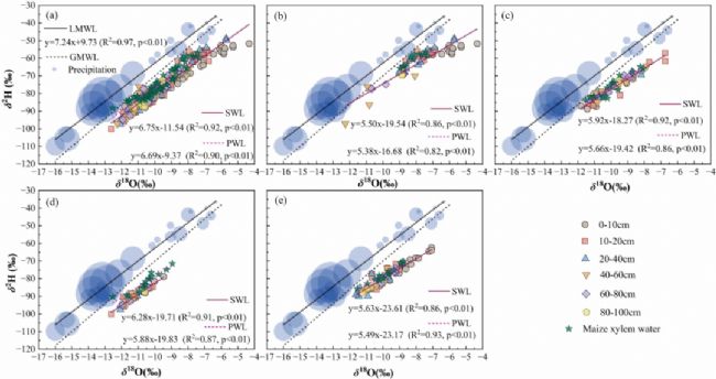 圖3 不同土層雨水、玉米莖水及土壤水的δ2H與δ18O關系。(a)所有采樣日期擬合δ2H與δ18O得到的線性方程;(b)7月9日擬合δ2H與δ18O得到的線性方程;(c)7月27日擬合δ2H與δ18O得到的線性方程;(d)8月10日擬合δ2H與δ18O得到的線性方程;(e)8月27日擬合δ2H與δ18O得到的線性方程。