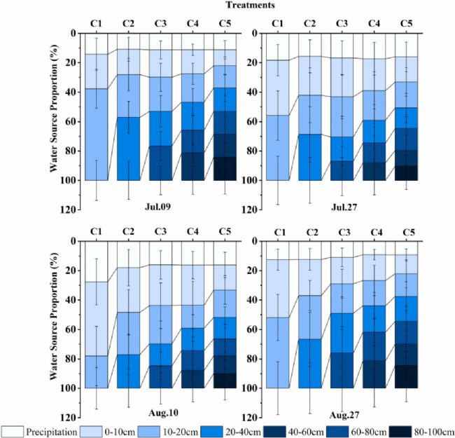 圖5 采樣期間土壤厚度20 cm (C1)、40 cm (C2)、60 cm (C3)、80 cm (C4)、100 cm (C5)處理不同土層土壤水及雨水對莖水相對貢獻比例的變化。