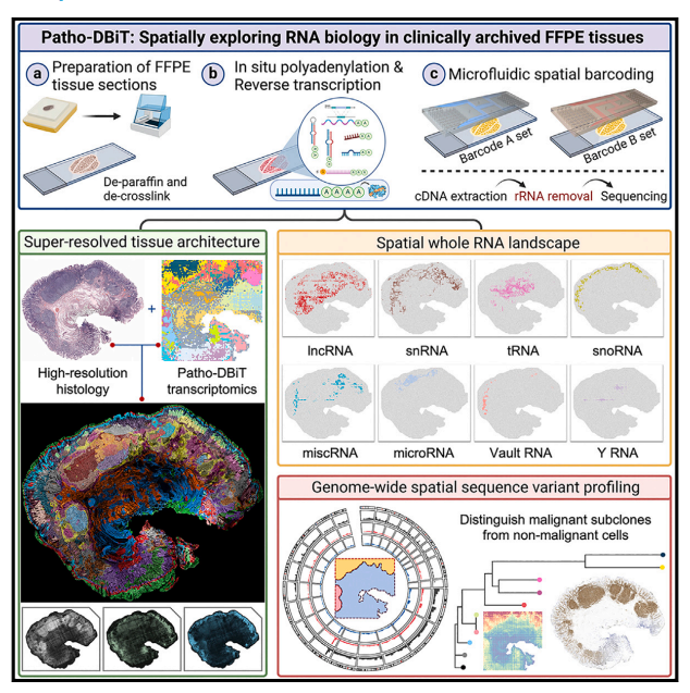文章摘要:對福爾馬林固定石蠟包埋(FFPE)組織中的 RNA 生物學進行空間探索的能力為組織病理學研究帶來了變革性的潛力。在這里,我們介紹了病理學組織兼容的確定性條形碼(Patho-DBiT),它結合了原位多聚腺苷酸化和空間全轉錄組測序的計算創新,專為探究臨床存檔 FFPE 樣品中的多種 RNA 而定制。它可以對基因表達和 RNA 處理進行空間協同分析,揭示特定區域的剪接異構體,并對保存 5 年的臨床腫瘤 FFPE 組織進行高靈敏度的轉錄組圖譜繪制。此外,還能捕獲全基因組單核苷酸 RNA 變異,以區分人類淋巴瘤中的惡性細胞和非惡性細胞。Patho-DBiT 還能繪制microRNA調控網和RNA剪接動態圖,解碼它們在空間腫瘤發生中的作用。單細胞水平的 Patho-DBiT 剖析了驅動腫瘤克隆結構和時空細胞動態進展。Patho-DBiT 是一個寶貴的平臺,可用于揭示 FFPE 組織中豐富的 RNA 生物學特性,幫助臨床病理學進行評估。